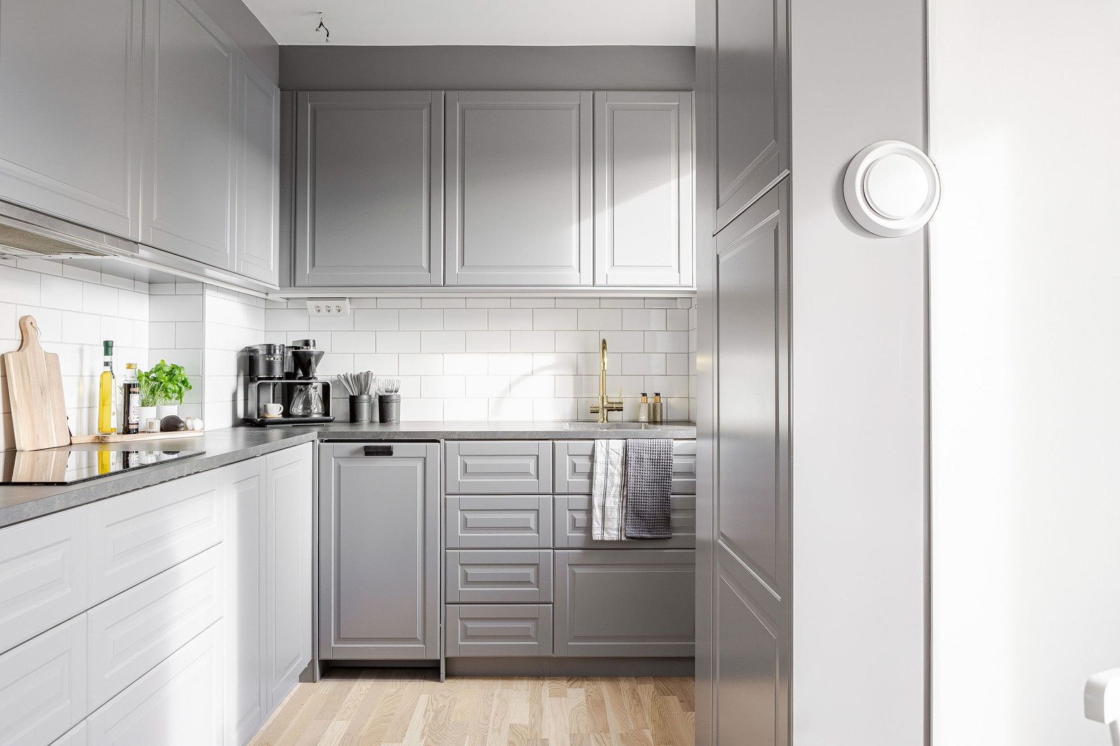 Hallen leder oss in till köket. Köket är nyrenoverat med gråa tidlösa luckor och mörk bänkskiva. Den maskinella utrustningen består av ugn, spishäll, kyl/frys samt diskmaskin. Plats för matgrupp finns vid fönstret.