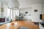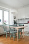 Ljust kök i öppen planlösning mot vardagsrum. Parkettgolv, ljust målade väggar och matplats. Kyl/frys, induktionshäll, fläkt, diskmaskin samt inbyggd ugn och mikro.