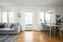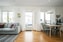 Ljust vardagsrum i öppen planlösning mot köket. Parkettgolv, ljust målade väggar samt utgång till balkong.