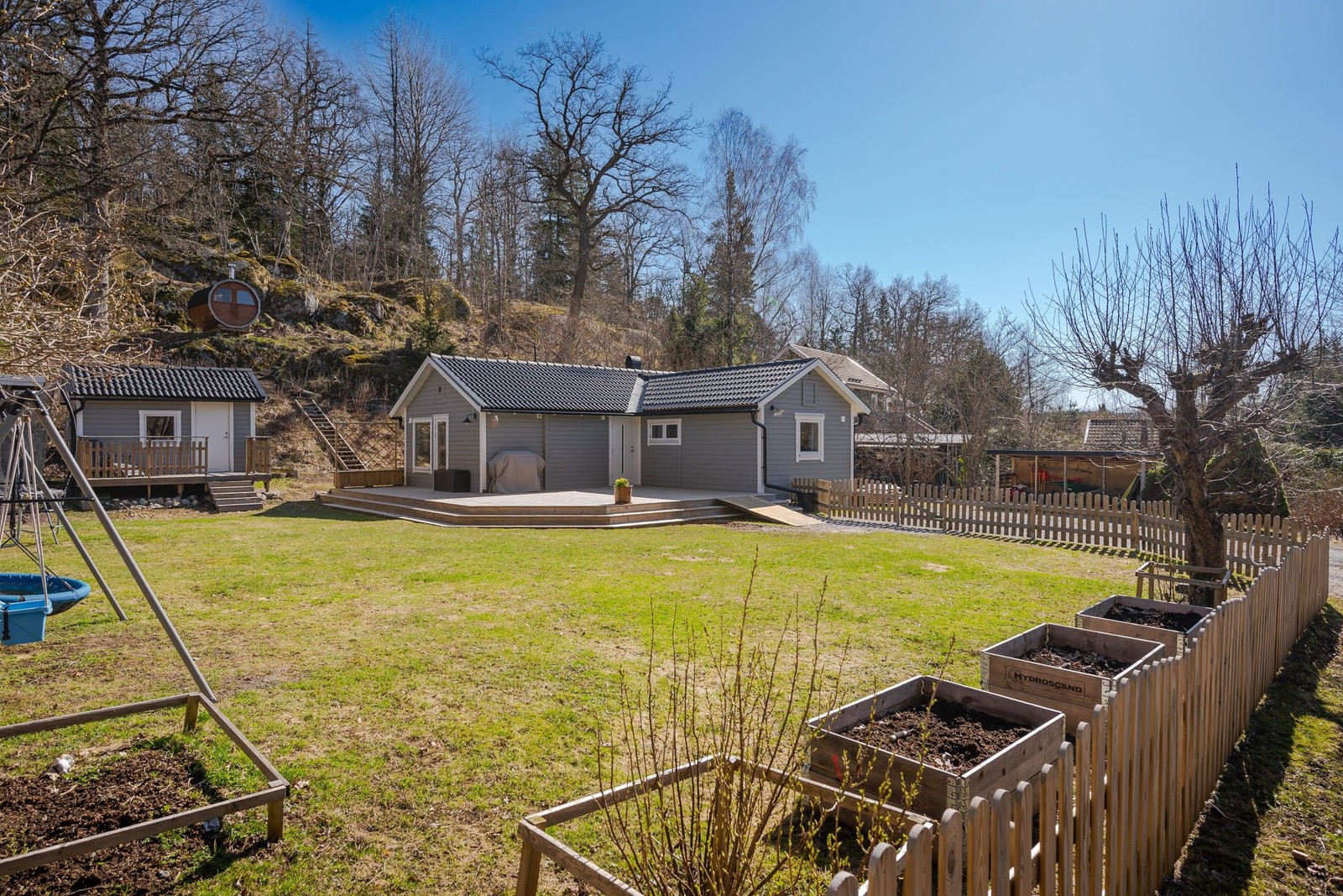 I källaren, som nås utifrån, finns en funktionell tvättstuga som underlättar vardagen (det finns även förberett för tvättmaskin i badrummet i huset) och utomhus väntar en stor, plan tomt. Perfekt för lek, odling eller sociala tillställningar i solen.