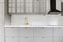 Fint renoverat kök med gråa köksluckor med vitrinskåp. Inbyggda vitvaror. Matplats vid fönster.