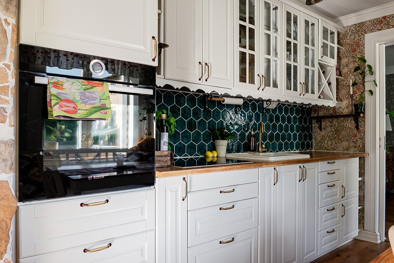Fint och tidlöst kök med vita skåpluckor och matplats. Utrustning: diskmaskin, fläkt, kyl/frys, varmluftsugn och induktionshäll samt integrerad mikrovågsugn.