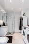 Fint renoverat badrum med klinkergolv i grå ton och vitt kakel på vägg. Golvvärme, dusch med glasväggar, kommod, spegelskåp samt tvättmaskin och torktumlare.
