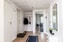 Kök med separat matplats i öppen planlösning mot vardagsrummet. Köket har vita köksluckor, plastmatta och vitmålade väggar.