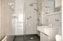 Nyrenoverat badrum från 2025 med plastmatta, kakel, dusch med glasväggar, tvättställ med kommod samt badrumsskåp.