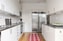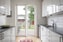 Stilrent kök med vita köksluckor och stor förvaring under trapp. Inbyggd ugn och mikrougn, induktionshäll, kyl, frys, fläkt samt diskmaskin.