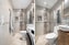 Badrummet på entréplanet är oväntat stort. Längst in finns duschhörnan bakom glaspartier. Det finns även en badrumskommod i ek under en spegel med ekram och belysning, toalett samt en tvättmaskin även om det finns gemensam tvättstuga i föreningen. Badrummet är inrett med kakel och klinker i harmoniska sandbeigea toner. Spotlights i tak och för ytterligare komfort har golvet värme (el)