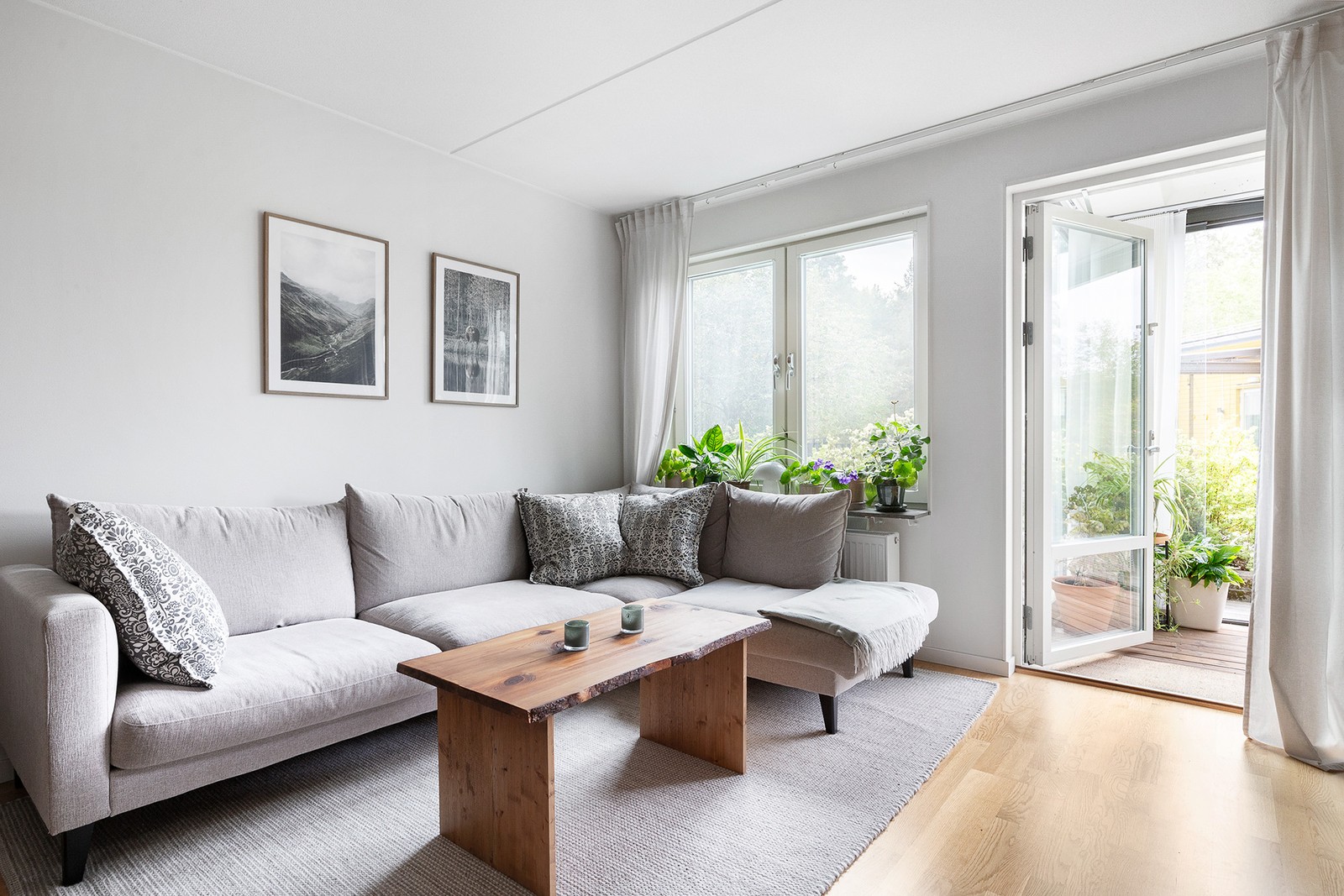 Köket är stilrent och fullt utrustat, med gott om arbetsytor och förvaring. Här finns utrymme för matplats intill fönstret, i nära kontakt med både vardagsrummet och uteplatsen. Vardagsrummet fungerar som hemmets sociala hjärta med plats för soffgrupp, och härifrån nås bostadens höjdpunkt – den stora uteplatsen.