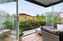 Från vardagsrummet nås den inglasade uteplatsen i söderläge. Uteplatsen är belagd med trallgolv och omgärdas av glaspartier som kan öppnas helt mot den anslutande uteytan. Inne i den inglasade delen finns plats för soffgrupp och växter. Utanför glaspartierna fortsätter trallen och erbjuder ytterligare yta med plats för bord och stolar. Uteplatsen vetter mot föreningens planteringar.