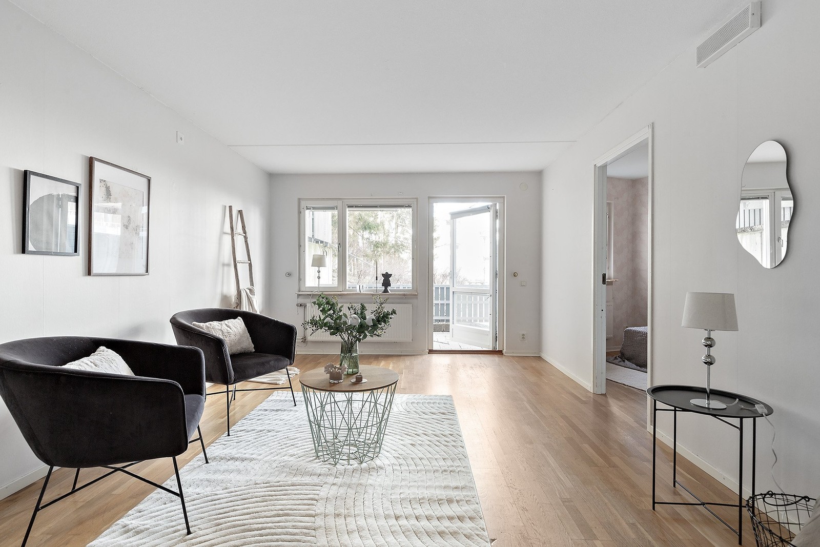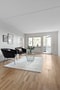Rymligt vardagsrum med vitmålade väggar och laminatgolv i träton. Rummet har stora fönsterpartier som ger ett fint ljusinsläpp samt utgång till bostadens uteplats i sydvästläge. Här finns plats för soffgrupp och övrigt möblemang.