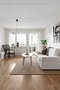 Vardagsrummet har ljusa väggar och parkettgolv. Rummet har fönsterparti som ger ljusinsläpp samt utgång till balkong. Ytan rymmer soffgrupp och övrig möblering. Vardagsrummet har öppen koppling mot hall och anslutning mot kök.