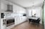 Köket är inrett med ljusa väggar och laminatgolv. Snickerier i vitt erbjuder gott om både arbetsyta och förvaring. Här finns spis med ugn, fläkt, diskmaskin samt kyl och frys. Intill fönstret ryms en matplats för fyra personer.