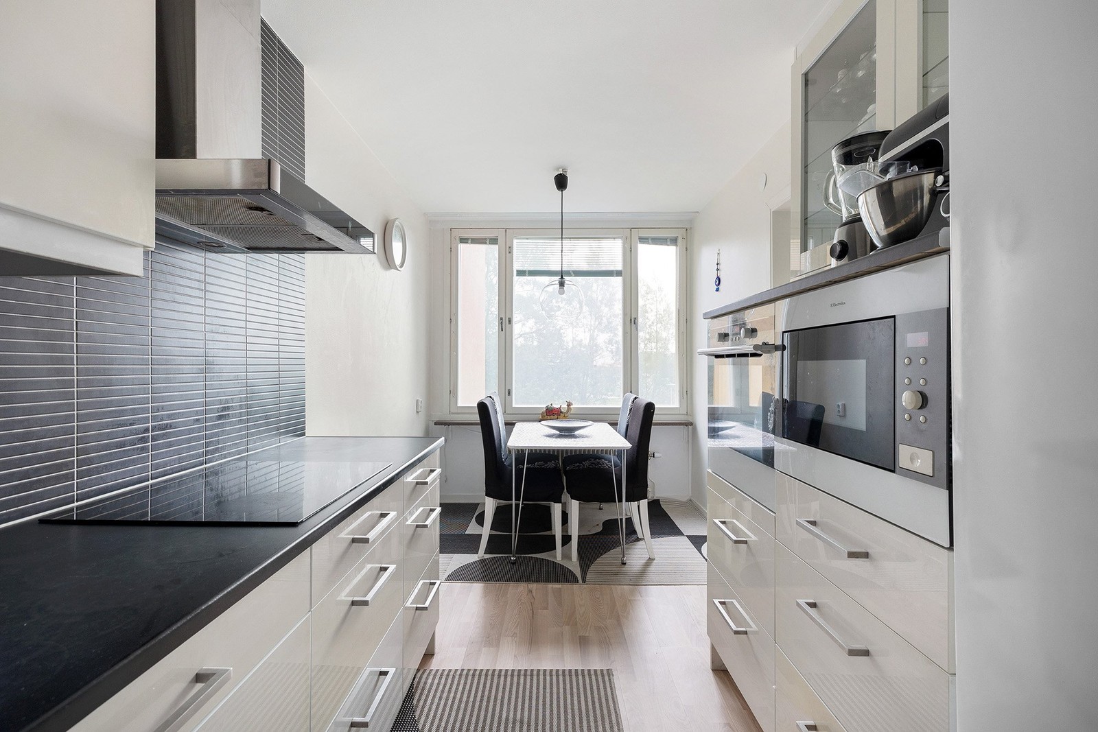 Köket är ljust och modernt med integrerade vitvaror och en matplats intill stort fönster. Badrummet är helkaklat med klinkergolv och tvätt/torkkombimaskin. Dyra renoveringar är redan gjorda med andra ord - här är det bara att flytta in och börja trivas från dag ett.