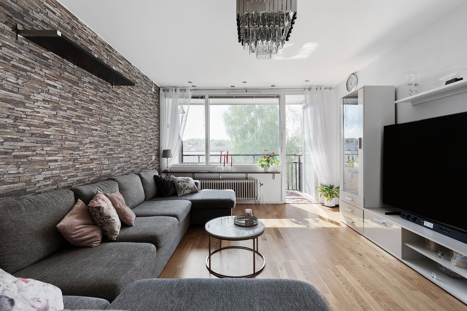 Vardagsrum med parkettgolv, vita väggar och en fondvägg med stenimitation. Stora fönsterpartier i söderläge med dragning mot sydväst ger ljus och sol från lunch till kväll och härifrån nås balkongen. I taket finns infällda spotlights.