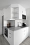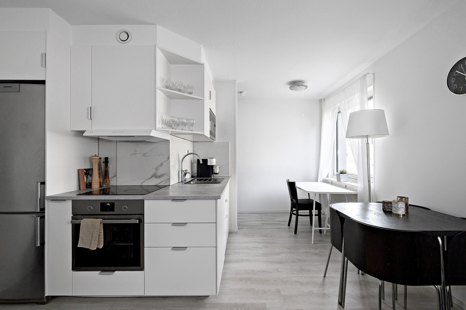 Smart kökslösning med vita snickerier. Praktiska arbetsytor och smart förvaring. Utrustat med kyl/frys, spishäll, köksfläkt, ugn samt inbyggd micro.