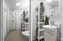 Stilrent och stambytt badrum med vita helkaklade väggar och ljusgrått klinkergolv. Rummet är utrustat med wc, tvättställ med kommod, spegelskåp med belysning samt duschhörna med rundade vikbara glasväggar. Här finns även plats för hylla eller annan mindre badrumsinredning. Stambytet ger en trygg och modern grund för badrummets installationer.