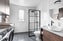 Helkaklade väggar i vitt och mörkgrått klinkergolv. Duschplats med fast duschvägg i industriglas med spröjsade svarta profiler. Golvstående wc. Kommod i träton med ovanpåliggande tvättställ och svart blandare, spegel ovan samt överskåp. Tvättdel med tvättmaskin och torktumlare med bänkskiva ovan som ger arbetsyta samt väggskåp för extra förvaring. Fönster för dagsljus och vädring.