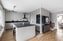 Köket har släta luckor i ljusgrå ton som kombineras med mörkgrå bänkskiva och stänkskydd i samma nyans. Diskho och blandare i svart samt spiskåpa i rostfritt stål. Den maskinella utrustningen består av integrerad diskmaskin, induktionshäll, inbyggd ugn och mikro samt kyl och frys i fullhöjd. En stor köksö med mörk bänkskiva ger generös arbetsyta, förvaring och plats för sittplatser. Stort fönsterparti intill arbetsbänken bidrar med rikligt dagsljus. Golvet är i parkett och väggarna målade i vitt.