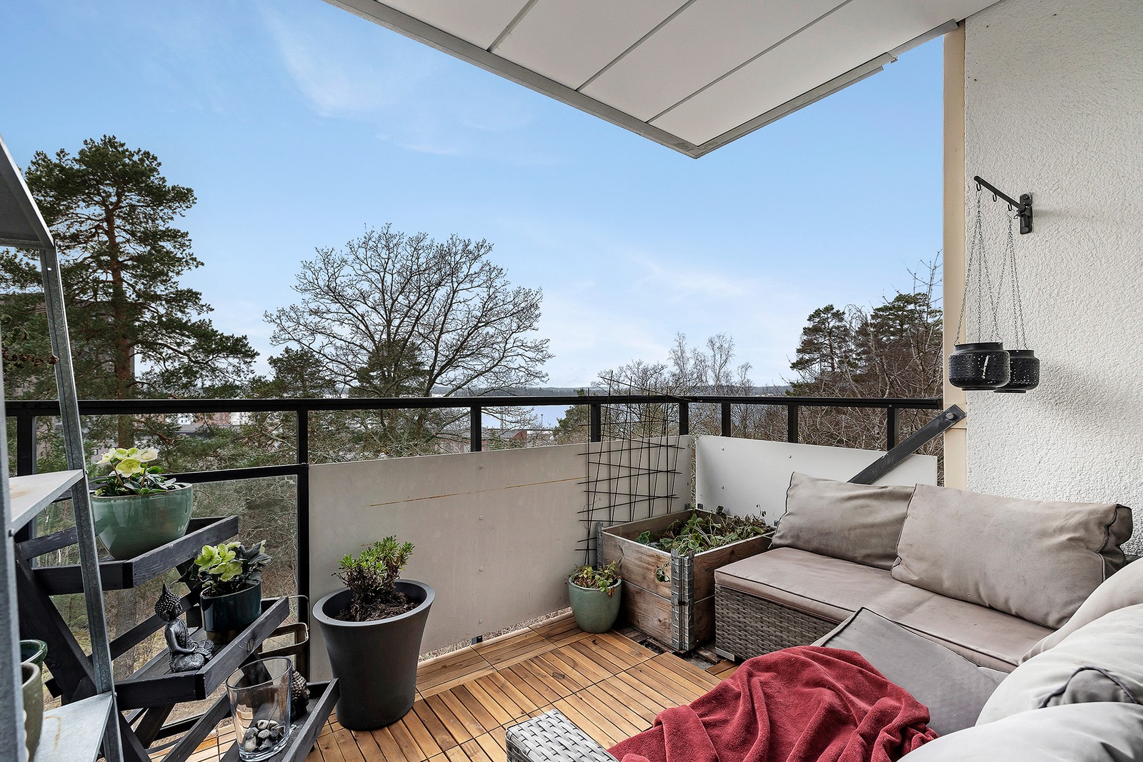 Balkongen ligger i högt läge med västerläge vilket ger goda solförhållanden och utsikt mot grönska och Mälaren. Golvet är belagt med trall och balkongen är delvis ingjuten i fasaden vilket ger ett skyddat läge med tak ovanför som ger bra väderskydd.