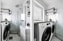 Badrummet har väggar klädda i vitt kakel och golv i ljus marmorerad klinker. Rummet är utrustat med duschhörna med glasdörrar, väggmonterad duscharmatur samt tvättställ med underskåp och spegel med belysning. Här finns även tvättdel med tvättmaskin och torktumlare placerade under en arbetsbänk. Ett fönster med frostat glas ger naturligt ljusinsläpp.