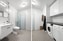 Badrummet är rymligt och smakfullt inrett med grått klinkergolv och vita helkaklade väggar som tillsammans skapar en tidlös och harmonisk känsla. Den stilrena designen gör det enkelt att trivas här, oavsett om det är morgonens snabba start eller kvällens avkopplande duschstund. I den praktiska tvättdelen finns både tvättmaskin och torktumlare, snyggt placerade under en arbetsbänk som ger gott om avställningsyta. Ovanför finns förvaringsskåp som rymmer allt du vill ha nära till hands, men ändå undanplockat.