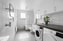 Det större badrummet är helkaklat med vita väggar och ljusgrått klinkergolv. Här finns badkar med glasduschvägg, wc, handfat med vit kommod från Vedum samt spegelskåp. En praktisk tvättdel med tvättmaskin och torktumlare under arbetsbänk under förvaringsskåp förenklar vardagen. Därtill finns en separat, helkaklad gäst-WC i anslutning till hallen. Förvaringen är väl tilltagen i lägenheten och kompletteras av en flexibel klädkammare nära hallen som i dag används som hemmakontor.