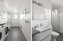 Helkaklat badrum med klinkergolv i grå ton och vita kaklade väggar. Utrustat med wc, handfat med kommod, spegelskåp samt dusch med glasväggar. Tvättmaskin och torktumlare placerade under arbetsbänk. Handdukstork finns. Fönster ger dagsljus och vädringsmöjlighet.