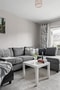 Stort och lättmöblerat vardagsrum med plats för både soffgrupp och matplats. Rummet har ljusa väggar, en fondvägg i mörk ton med mönster samt ljust laminatgolv. Från vardagsrummet nås bostadens balkong via glasade dörrar som ger fint ljusinsläpp.