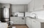 Kök med plastmatta i parkettmönster, ljusa skåpsluckor och tapetserade väggar. Kaklat stänkskydd ovan bänkskiva samt diskho. Köket är utrustat med större kyl och frys, ugn, spishäll och integrerad diskmaskin. Matplats finns i anslutning till fönster som ger naturligt ljusinsläpp.