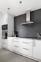 Kök med vita släta luckor, mörk bänkskiva och rektangulärt kakel i liggande sättning som stänkskydd. Väggarna är ljusa, taket är vitt med infällda spotlights och golvet är i parkett. Matplats vid fönster. Utrustat med spishäll, ugn, fläkt, integrerad diskmaskin samt kyl och frys. Förvaring i över och underskåp.