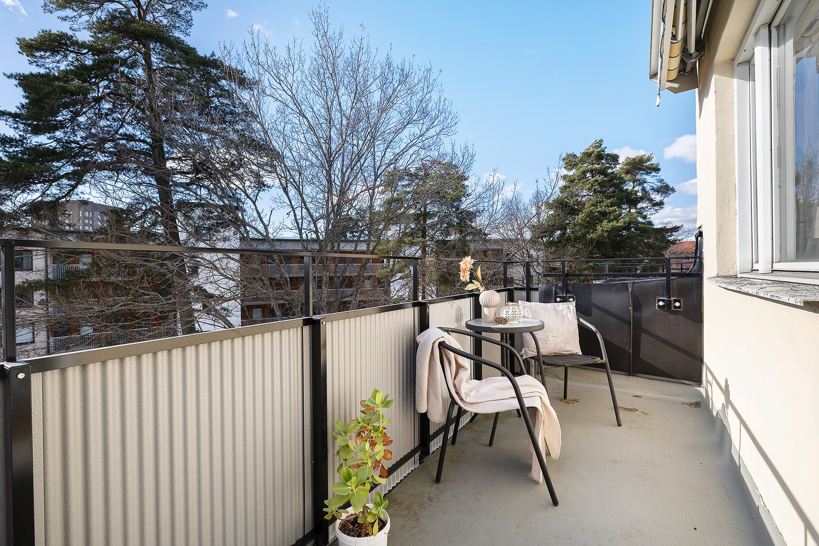 Högst upp med stor terrassbalkong i fritt lugnt sydvästläge som vetter med unikt läge mot lugn gård.