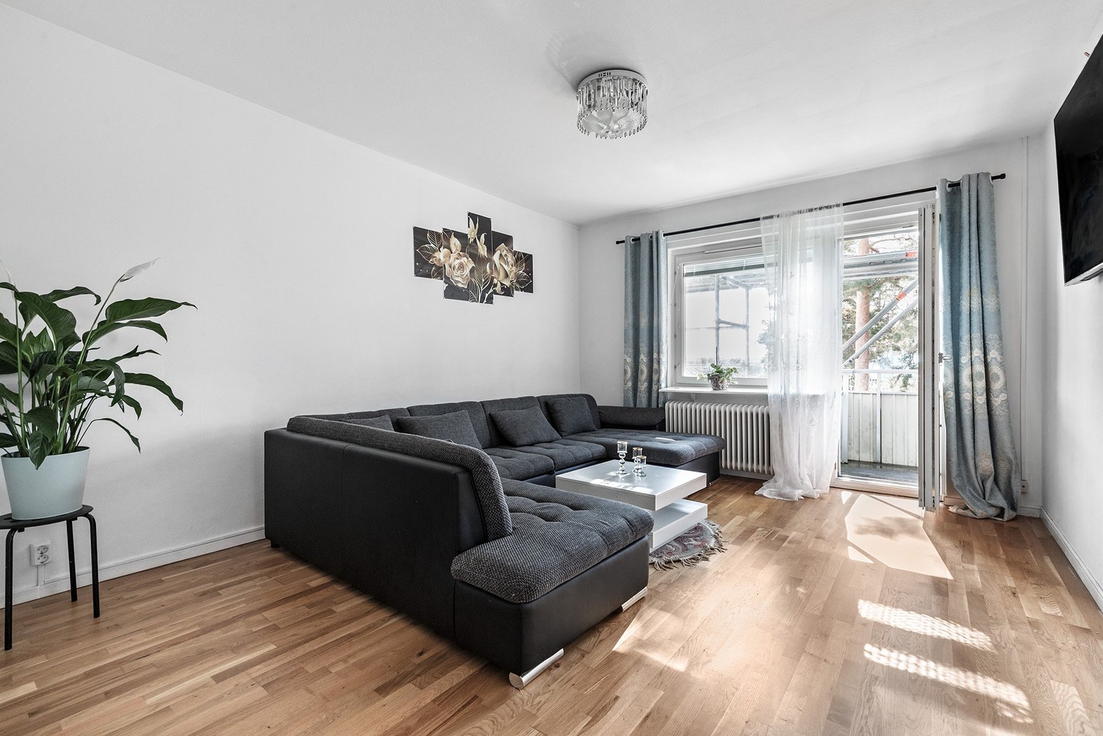 Vardagsrum med parkettgolv och vitmålade väggar. Rummet rymmer både soffgrupp och tv-möbel. Ett större fönsterparti tillsammans med balkongdörren ger gott om ljusinsläpp. Den högre takhöjden bidrar till en luftig känsla.