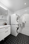 Helkaklat badrum med vita väggplattor och svart klinkergolv. Utrustat med duschhörna med duschstång och draperi, vägghängd WC, kommod med handfat och spegelskåp med belysning. Tvättmaskin och torktumlare är installerade i praktisk stapel.