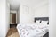 Ljus sovalkov med fönster och plats för dubbelsäng. Förvaring i garderober och överskåp. Separeras från vardagsrumsdelen med gardin. Väggar i ljus kulör och parkettgolv.