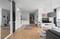 Ljust vardagsrum i öppen planlösning mot köket. Stora fönster i två väderstreck och utgång till inglasad balkong som ger fint ljusflöde. Parkettgolv och vita väggar. Garderobsvägg med skjutdörrar ger bra förvaringsmöjligheter.