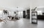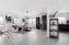 Köket från HTH har tilltagna arbetsytor på bänkskivan i grått som sträcker ut sig under en matchande sober grå glasskiva som skyddar väggen upp till överskåpen. Snickerierna är i en elegant gråsvart ton och köksutrustningen är komplett med hel separat kyl och frys, spishäll, köksfläkt, ugn och mikro samt diskmaskin. Utrustningen är integrerad eller inbyggd vilket bidrar till att skapa en stramare och elegantare känsla som är genomgående i hela köket. På golvet finns det påkostade vinylgolvet och väggarna är målade i vitt. I taket finns spotlights.