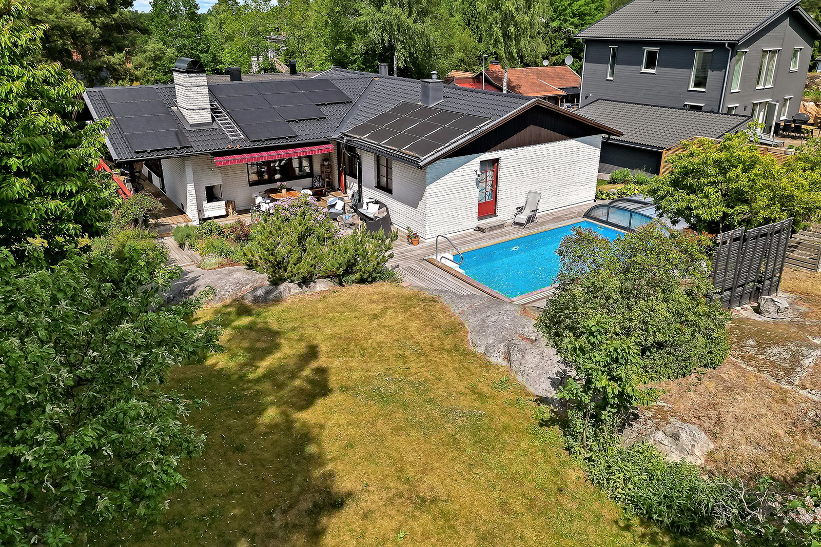 Representativ familjevilla i Skälby om 293 kvm med pool, hörntomt och hållbara energilösningar