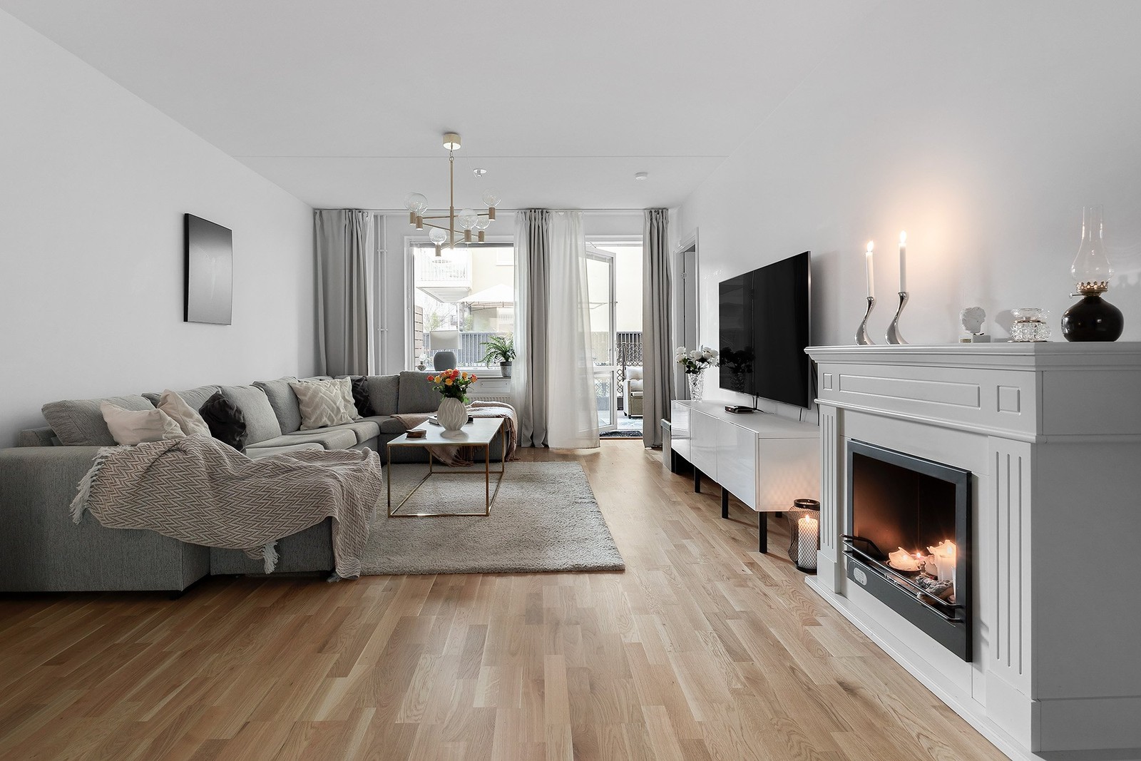 Öppen planlösning mot kök och utgång till uteplatsen. Ekparkettgolv och vitmålade väggar.