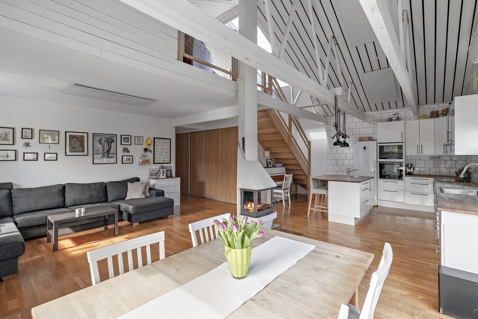 Utöver boarean på entréplanet tillkommer ytterligare 30 kvm golvyta med två rum på det övre planet.