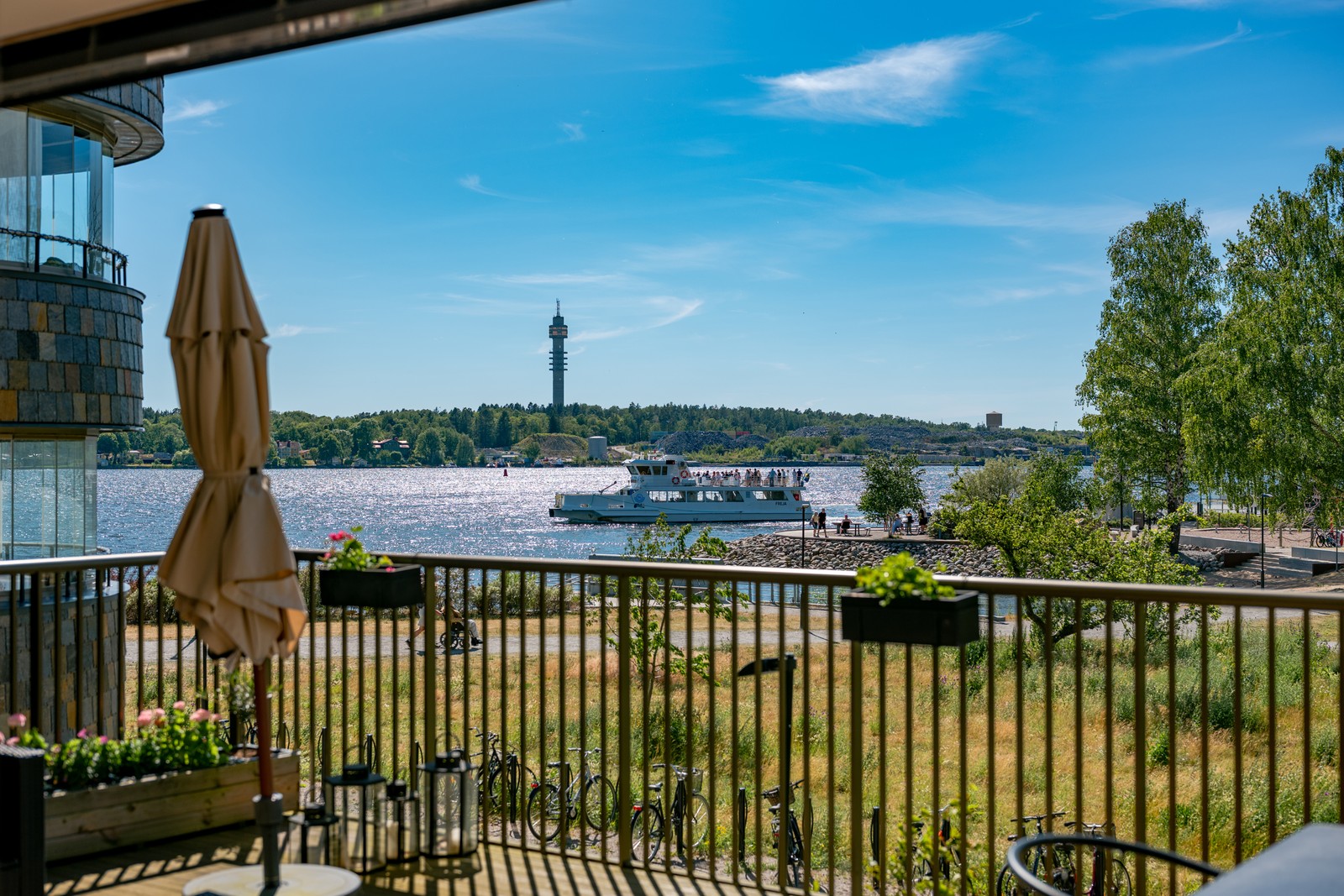 Terrass, 35 kvm, vetter rakt mot sjön och erbjuder plats för både loungegrupp och middagsbord – en perfekt plats för avkoppling eller sociala stunder i solen.