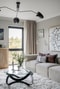 Ljust och luftigt vardagsrum med stora fönster och plats för soffgrupp. Fönster i söderläge med fri utsikt.