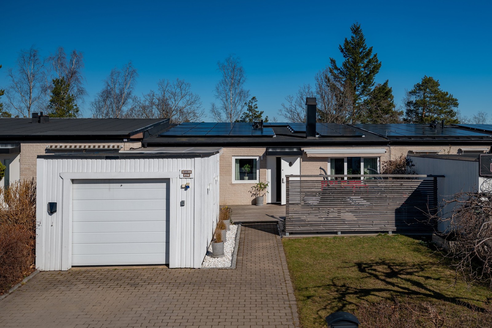 Här finns den stora terrassen – delvis under tak – som ger gott om plats för umgänge, grillkvällar och lata sommardagar. Allt inramat av grönska och skyddat läge.
