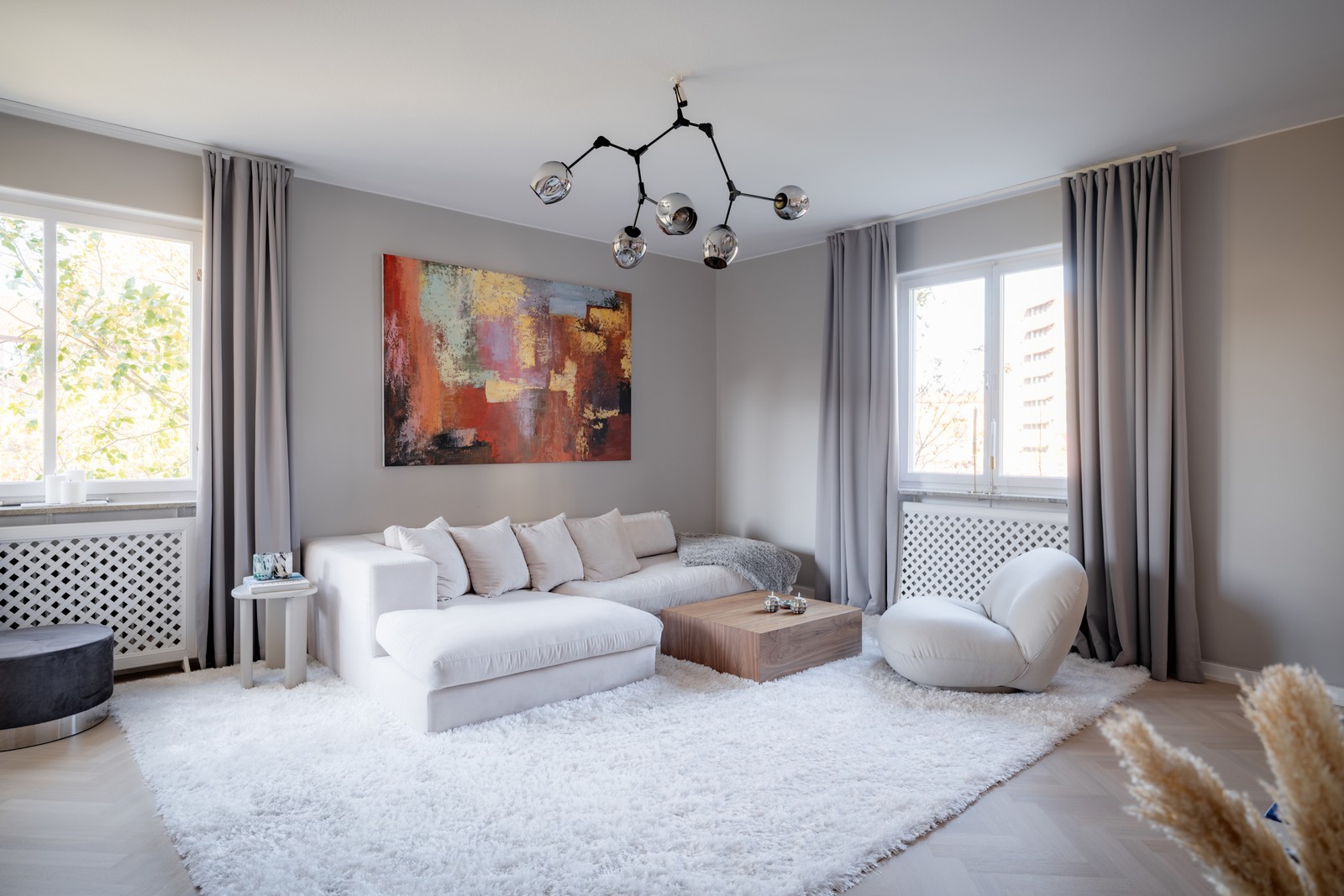Generöst, lätt möblerat och socialt vardagsrum med flera fönster och