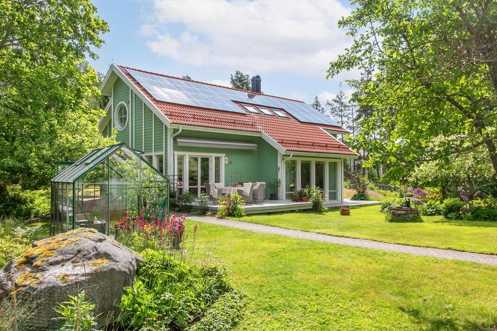 Helt insynsskyddat med vacker trädgård och uteplatser i alla väderstreck, granne med naturreservat.