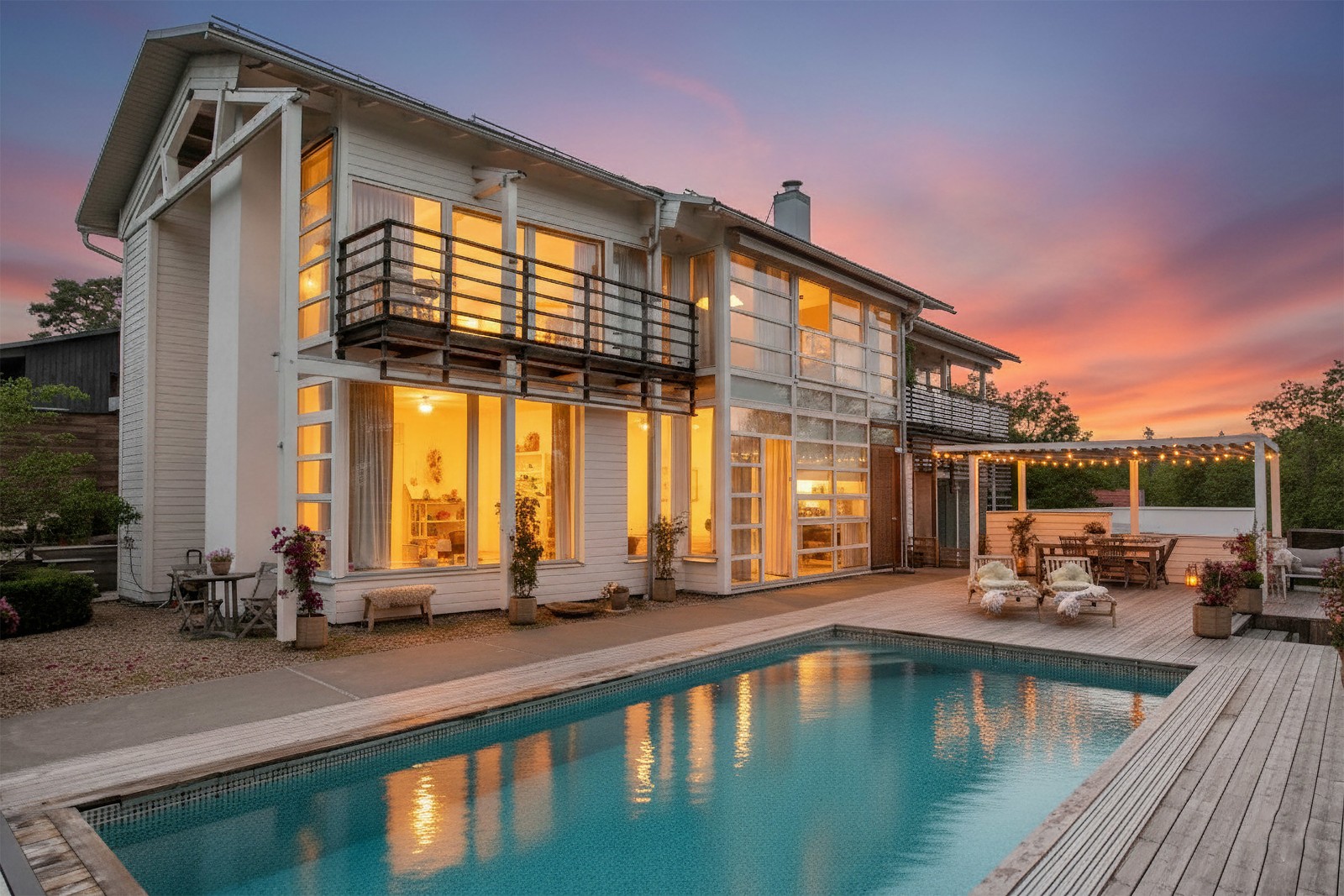 Det generösa och insynsskyddade poolområdet är underbart med en 4 x 8 meters pool med tillhörande pooltak och uppvärmning via luftvärmepump. Härfinns stora ytor för solstolar, loungemöbler och plats för middagar i skuggan av pergolan. Intill väntar ett charmigt bastuhus med egen altan – perfekt efter kvällsdoppet.