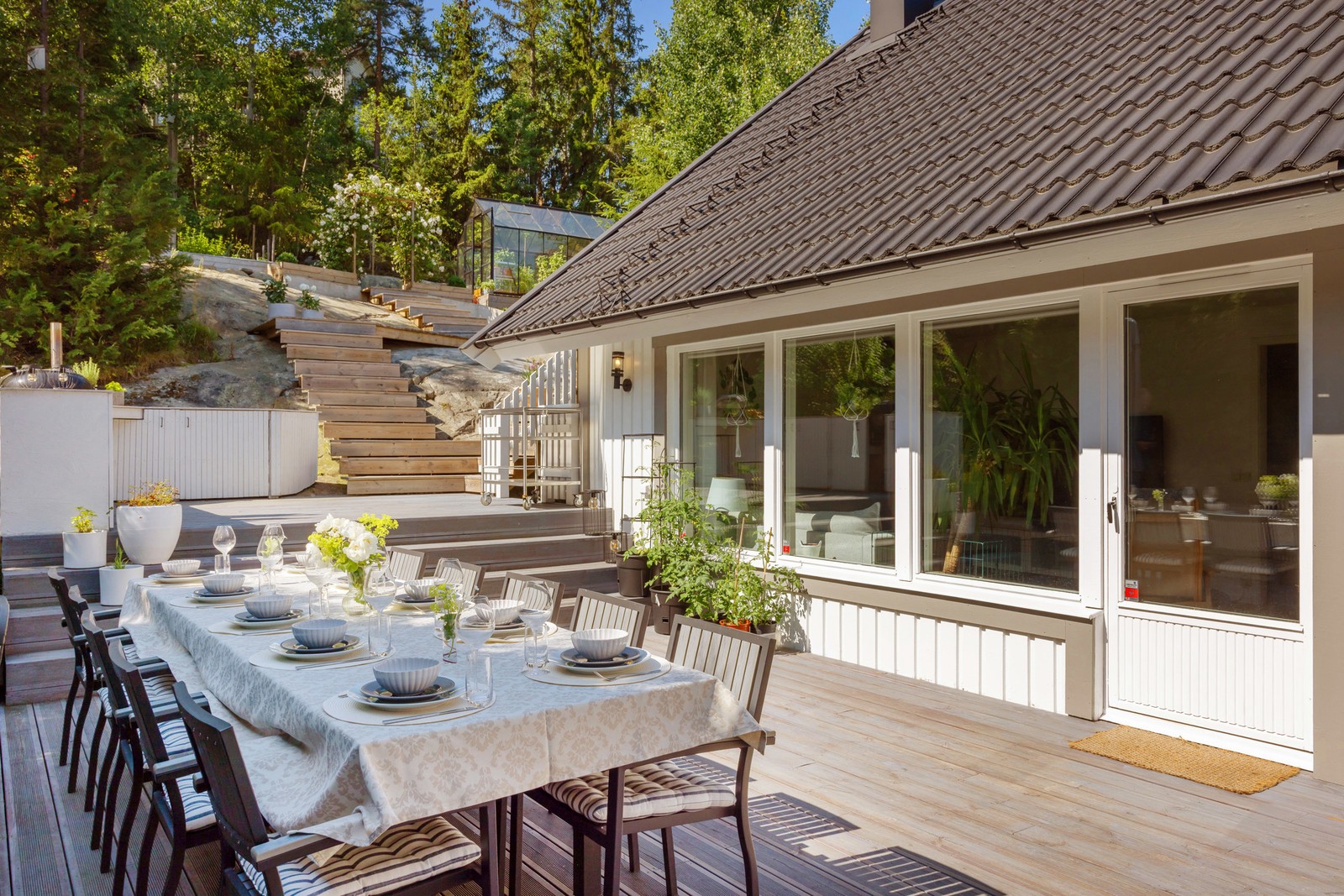 Plan gräsmatta samt flera terrasser utanför huset och uppe på berget.