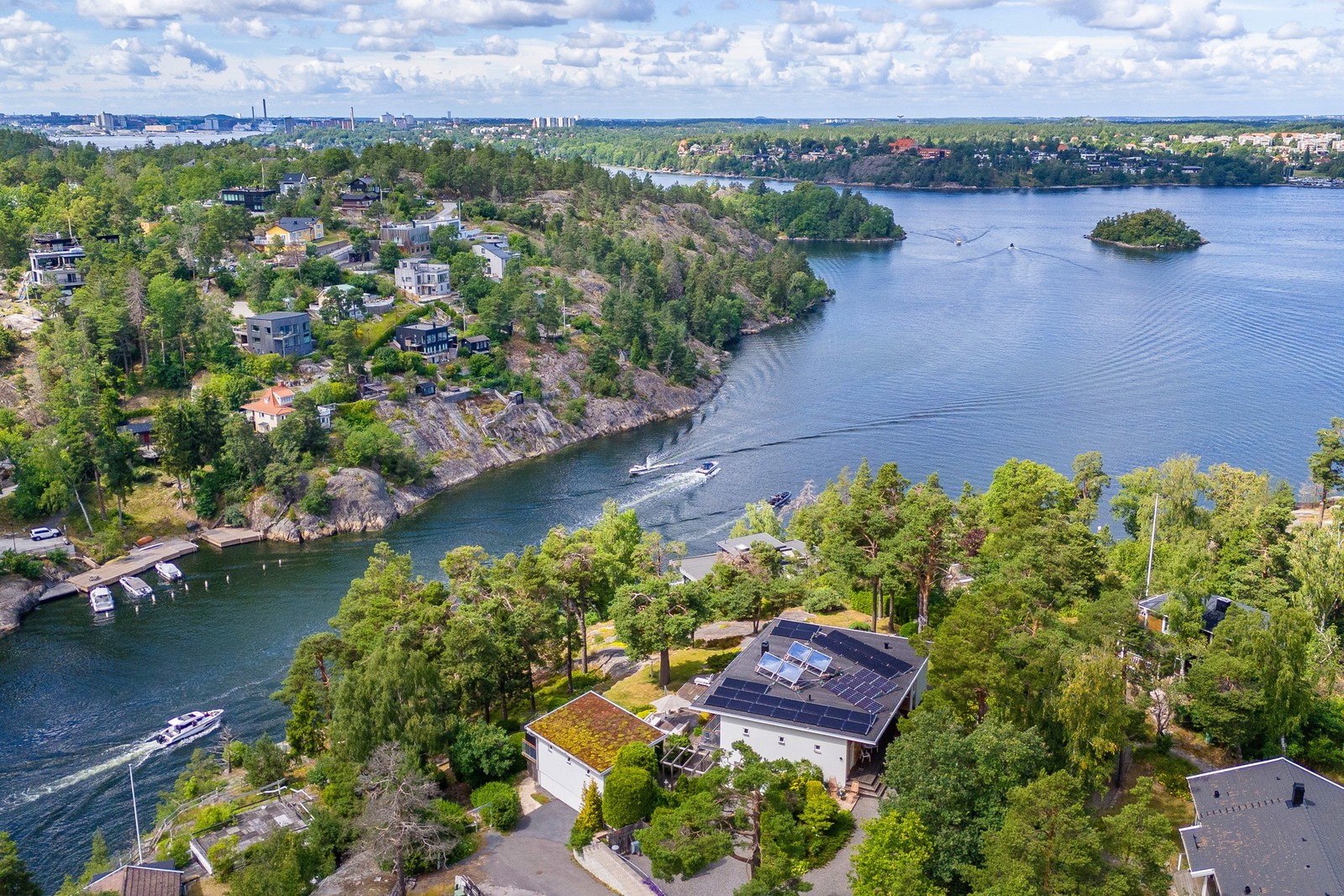 Vackert arkitektritat och påkostat hus om totalt 276 kvm på en fastighet i bästa läge med en magisk sjöutsikt alldeles vid Skurusundets vatten. Huset är mycket energieffektivt, i bästa energiklass A. Bostaden värms upp via bergvärme och har även solceller på taket. Bostadens entréplan är inbjudande med ljusa härliga öppna sällskapsytor med stora fönsterpartier som vetter åt vattnet längs Skurusundet och åt Stockholms inlopp. Bostadens rum har genomgående ljusa målade väggar och vackert trägolv med vattenburen golvvärme i båda planen. Idag finns tre luftiga sovrum med möjlighet att enkelt skapa ett fjärde. Badrummen är smakfulla och det finns ett av dessa i husets vardera våningsplan. En hiss finns även att tillgå mellan de två våningsplanen för extra smidighet. En trappa ner erbjuder bostaden en härlig spaavdelning med bastu och relax. Från detta våningsplan nås även ett mysigt uterum med access till trädgården och dess svalkande pool som är belägen intill ena trädäcket som har en enastående vy ut över vattnet vid Stockholms inlopp samt även vackra Skurusundet.