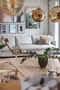 Ljus sällskapsdel med kök och vardagsrum i öppen planlösning. Det finns gott om plats för både soffgrupp och matplats. Stora fönsterpartier från golv till tak släpper in rikligt med ljus och ger utgång till de fina uteplatserna.
