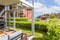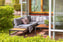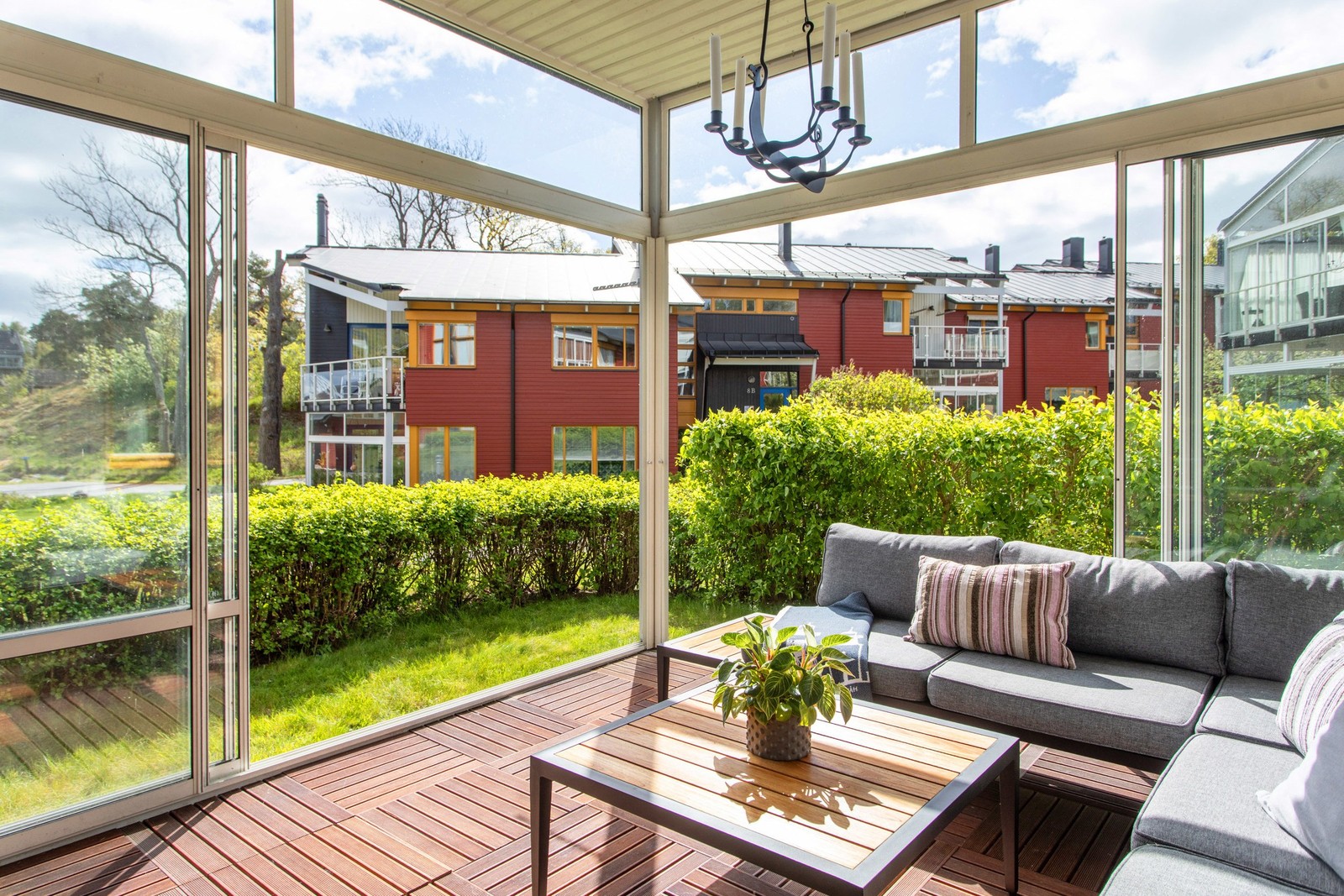 Stort inglasat uterum med utsikt ner mot vattnet och bryggorna och sol större delen av dagen sommartid. Här finns plats för en större loungegrupp att sitta i och njuta av utsikten och den vackra miljön.