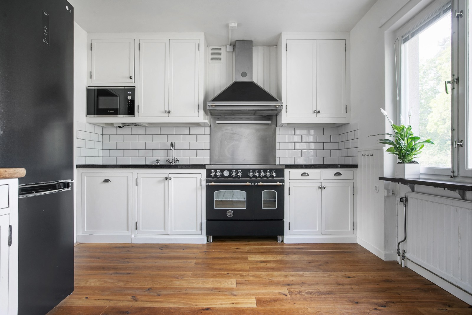 I hallen möts du av massivt ekgolv och god förvaring i form av två garderober. Det exklusiva, platsbyggda köket i furu är målat i antikvit linoljefärg och toppat med en elegant svart marmorskiva. Här finns en 90 cm Bertazzoni-spis för matlagningsentusiasten, samt samma vackra massiva ekgolv som i hallen. Sovrummet erbjuder en rymlig klädkammare med plats för skrivbord, perfekt för den som vill kombinera vila och arbete. Vardagsrummet pryds av original ekparkett från 1950 och får rikligt med ljus. Från vardagsrummet når du en stor balkong i soligt söderläge med utsikt mot en lummig innergård – en oas mitt i staden. Det helkaklade badrummet är utrustat med duschvägg, handfat med spegelskåp ovan samt wc. Fint ljusinsläpp från frostat fönster.
